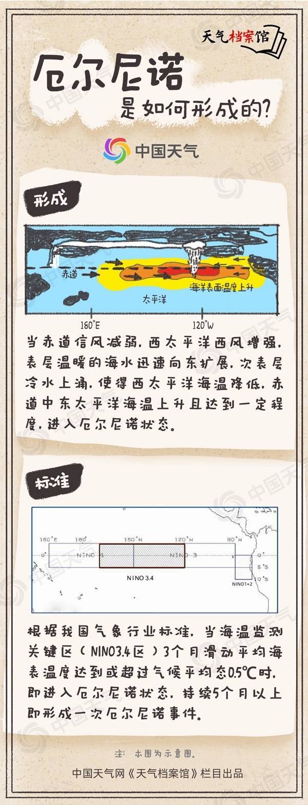 厄尔尼诺名字来自于西班牙语,原意是小男孩,也指圣婴,是指赤道东太平洋海温持续偏高并造成大气环流异常的一种气候现象。根据我国气象行业标准,当海温监测关键区(NINO3.4区)3个月滑动平均海表温度达到或超过气候平均态0.5℃时,即进入厄尔尼诺状态,这种情况持续5个月以上,即形成一次厄尔尼诺事件。